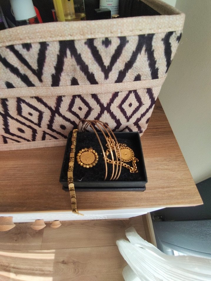 Altın renginde, işlemeli desenlere ve boncuk detaylara sahip kadın bilekliği, seti HEPSİ ÇELİKTİR KESİNLİKLE KARARMA YAPMAK HEPSİNİN FİYATİDİR 1 ADET DORİKA TOPLU KOLYE UCU VAR 4 ADET İNCE AJDA VAR 1 ADET ÇEYREK ALTINLI BİLEKLİK VAR 1 ADET ÇELİK BİLEKLİK VAR