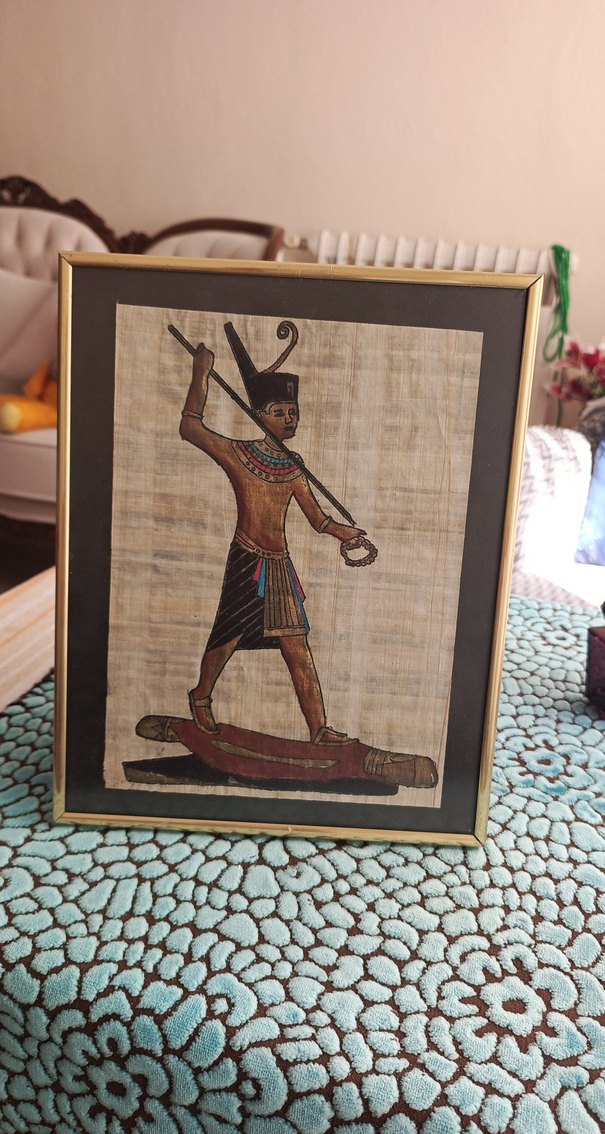 Altın çerçeveli, koyu renk tonlarında antik Mısır figürü içeren tablo. Geleneksel kıyafet ve semboller görülür.