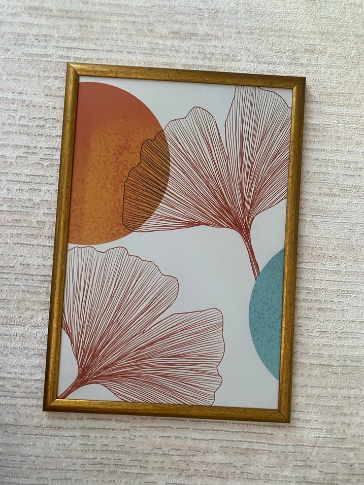 Eni :37 cm boyu : 53 cm Altın çerçeveli, ince çizgilerle yaprak figürleri ve renkli dairelerin yer aldığı soyut bir tablo.