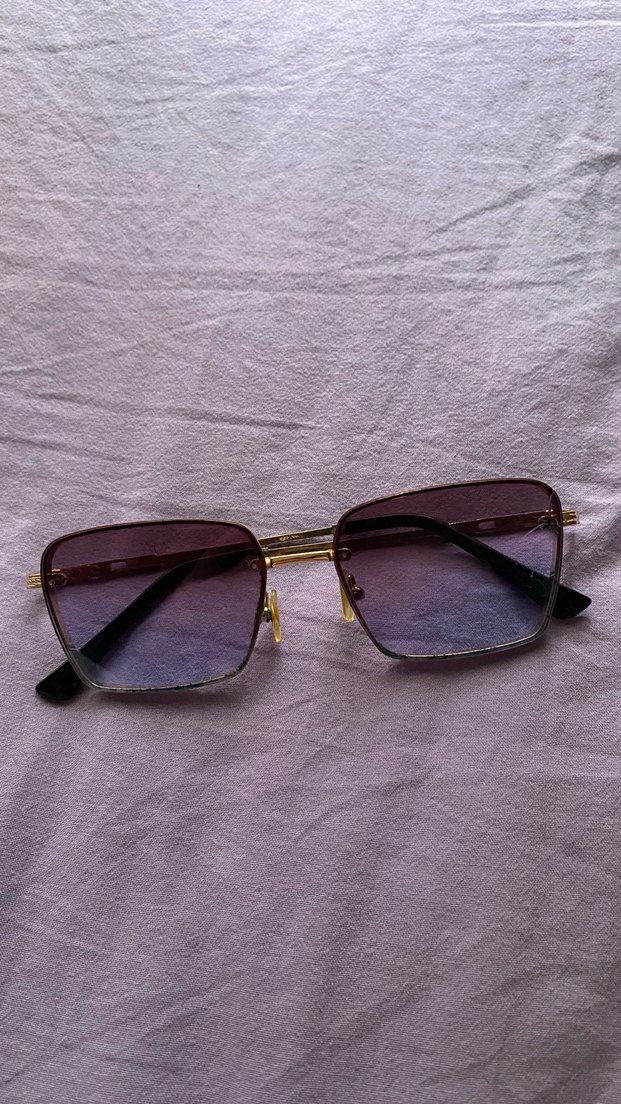 Altın çerçeveli, parlak mor camlı kadın güneş gözlüğü, butikten alınmıştır