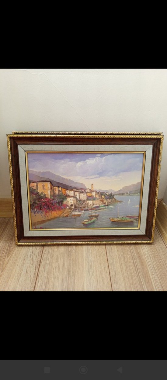 Pastel tonlarda deniz kenarı köyü, tekneler ve dağlar betimlenmiş, altın işlemeli çerçeve ile sunulmuş tablo.