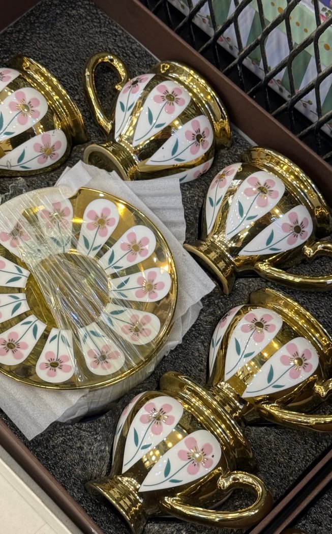 Altın kaplama ve pembe çiçek desenleriyle süslenmiş porselen fincan takımı, zarif ve canlı bir görünüme sahiptir.