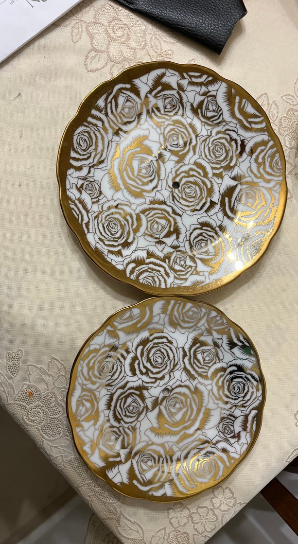 İki adet parlak altın çiçek desenli, klasik stil porselen tabak. Dalgalı kenarlarıyla şık sunumlara uygundur. ️iki katlı tabak mekanizması yok