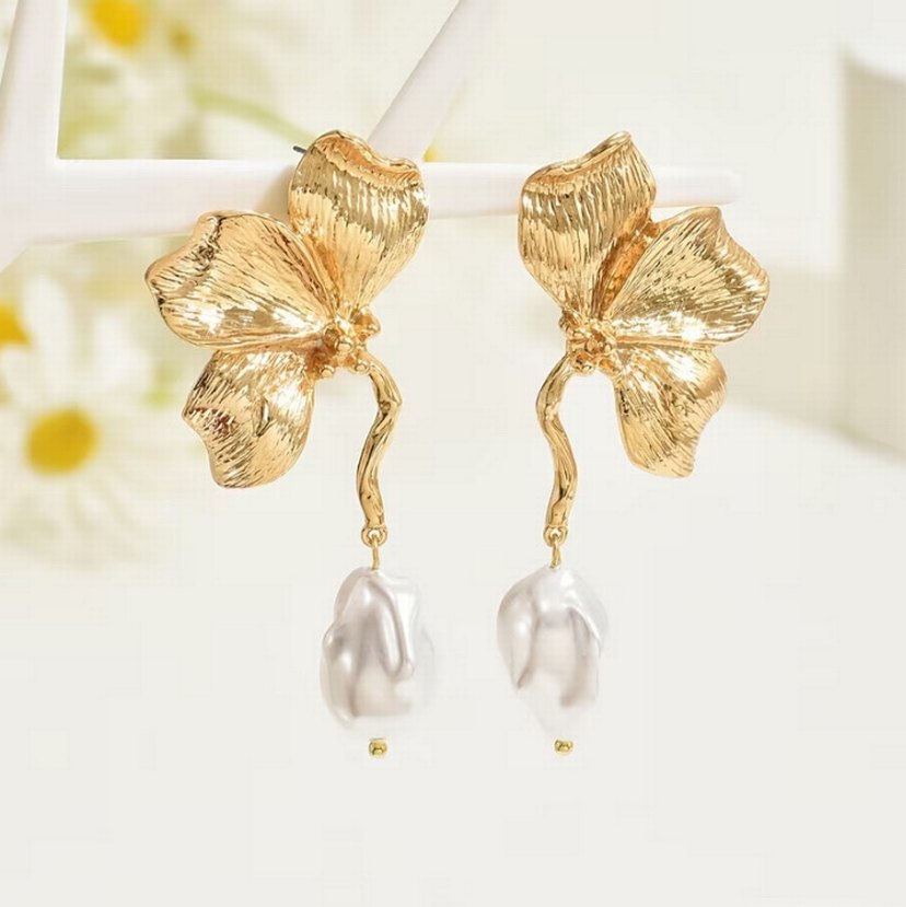 Altın renkli, çiçek desenli uzun boncuklu küpeler, düğün ve şık etkinlikler için uygun.
