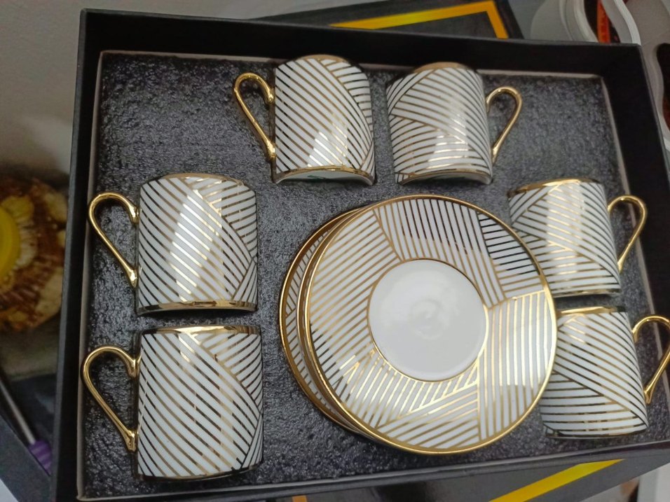Altın çizgili beyaz fincanlar ve uyumlu tabaklardan oluşan kahve ya da çay servisi için uygun set. ☕