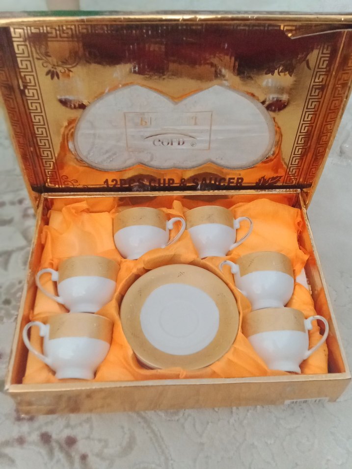Altın detaylı beyaz 6 adet fincan ve 6 adet tabağın, turuncu saten kaplı şık kutuda seti. ☕