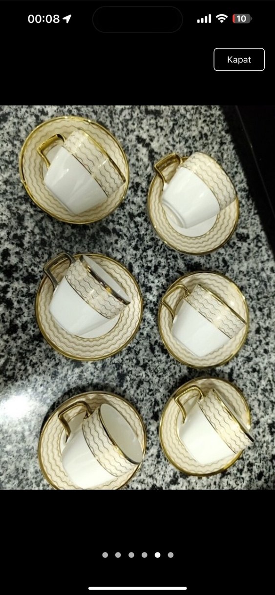 Altın kulplu ve dalgalı desenli beyaz fincan ve tabaklardan oluşan şık servis seti. ☕ ürün az kullanıldı temizdir ‼️