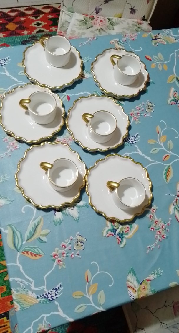 Altın detaylı beyaz kahve fincanları ve dalgalı tabaklardan oluşan şık set. Kahve sunumu için zarif ve ince tasarım. ☕