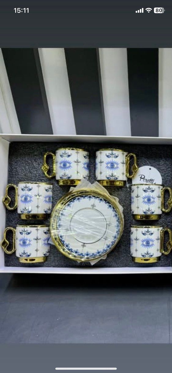Altın saplı ve kenarlı beyaz kahve fincanları, mavi göz desenleriyle süslenmiş. Yanında uyumlu mavi desenli tabaklar bulunur. ☕