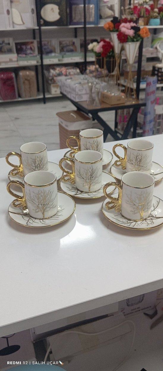 Altın renkli kulpları ve ağaç dalı desenleri olan beyaz kahve fincanı ve tabağı seti. Espresso sunumu için uygundur. ☕