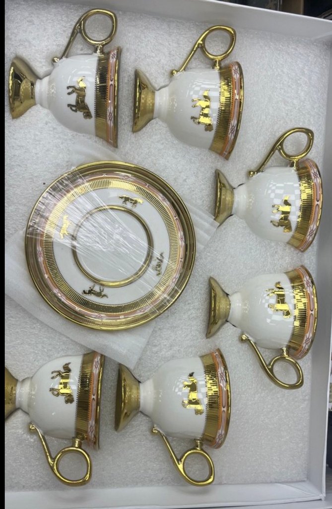 Altın saplı ve desenli beyaz kahve fincanları ile uyumlu tabaklardan oluşan şık set. Kahve sunumu için ideal. ☕