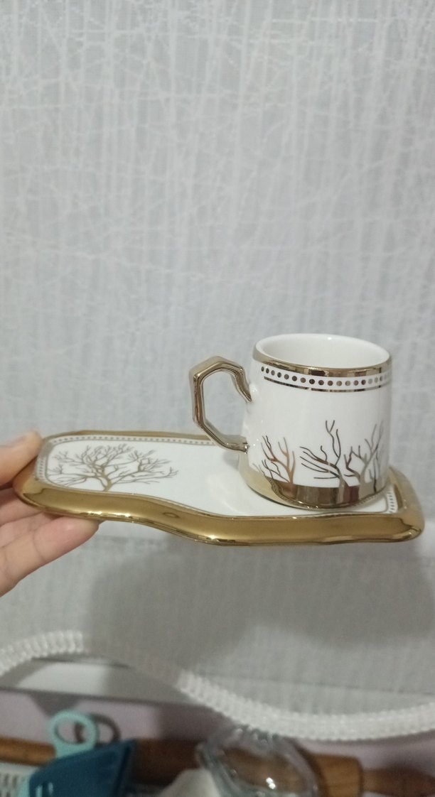 Altın detaylı, ağaç dalı desenli beyaz kahve fincanı ve tabağı. Fincanın kulpu ve tabak kenarı parlak altın renkte. ☕ isteyene 6 li 12 parca gonderilir