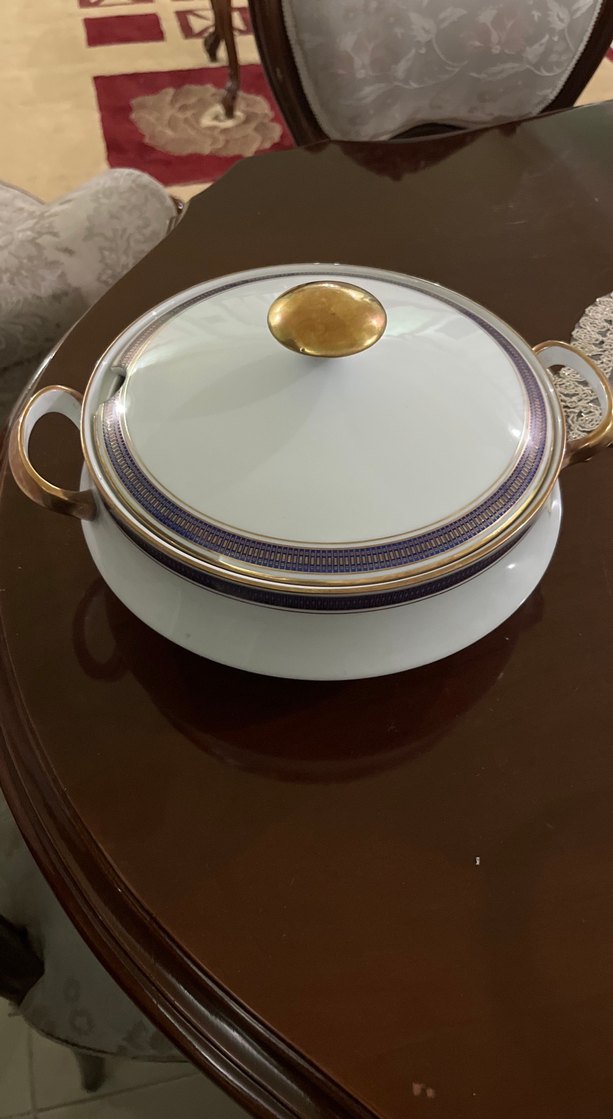 Altın kulplu, kapaklı parlak beyaz servis tabağı. Kapağın üstünde altın renkli tutacak ve mavi detaylı ince süsleme bulunur. ️