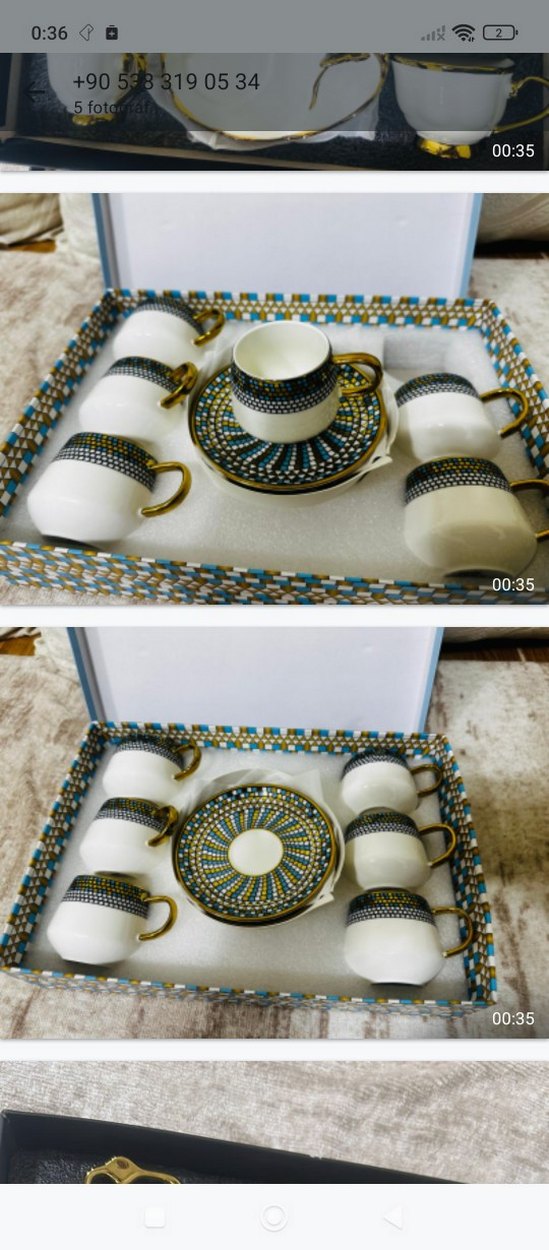 Altın kulplu beyaz porselen kahve fincanları ve detaylı desenli tabağı içeren set. ☕