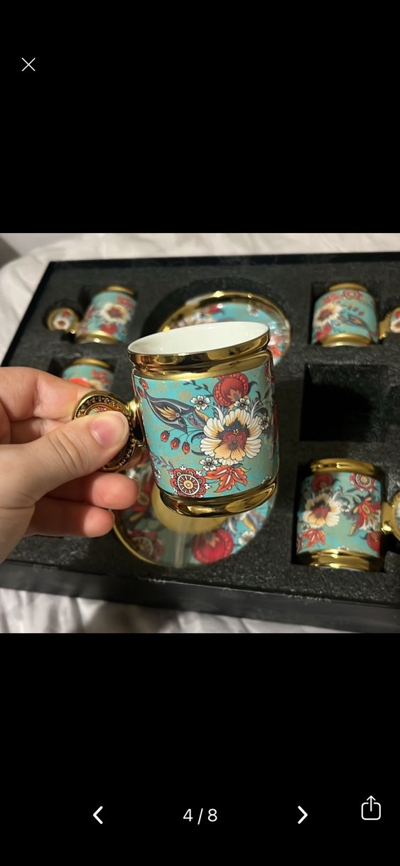 Altın renkli kenar ve kulplara sahip, canlı çiçek desenleriyle süslenmiş küçük fincanlar seti. Koyu çok renkli zemin üzerinde şık tasarım. MARKASI ACAR HOME 5 KİŞİLİK İSTERSENİZ 4 olarak da satarım 1 tanesi eksik geldi