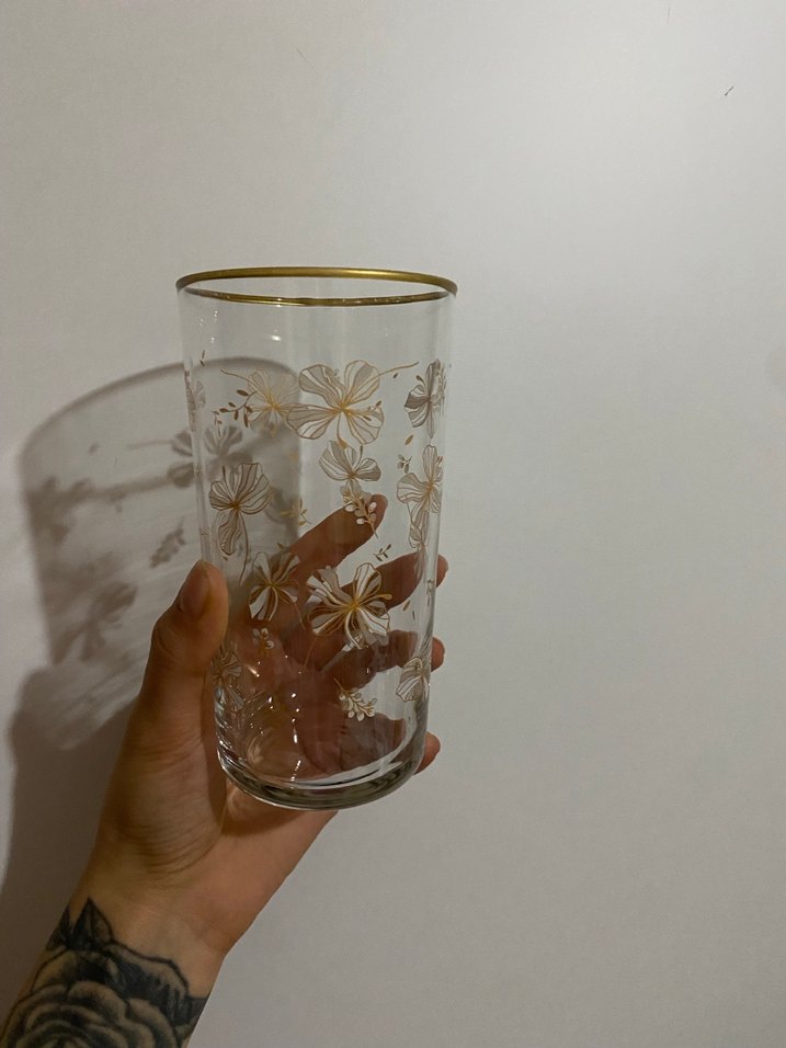 Altın renkli çiçek desenleri ve kenarında ince altın detay bulunan uzun cam bardak.