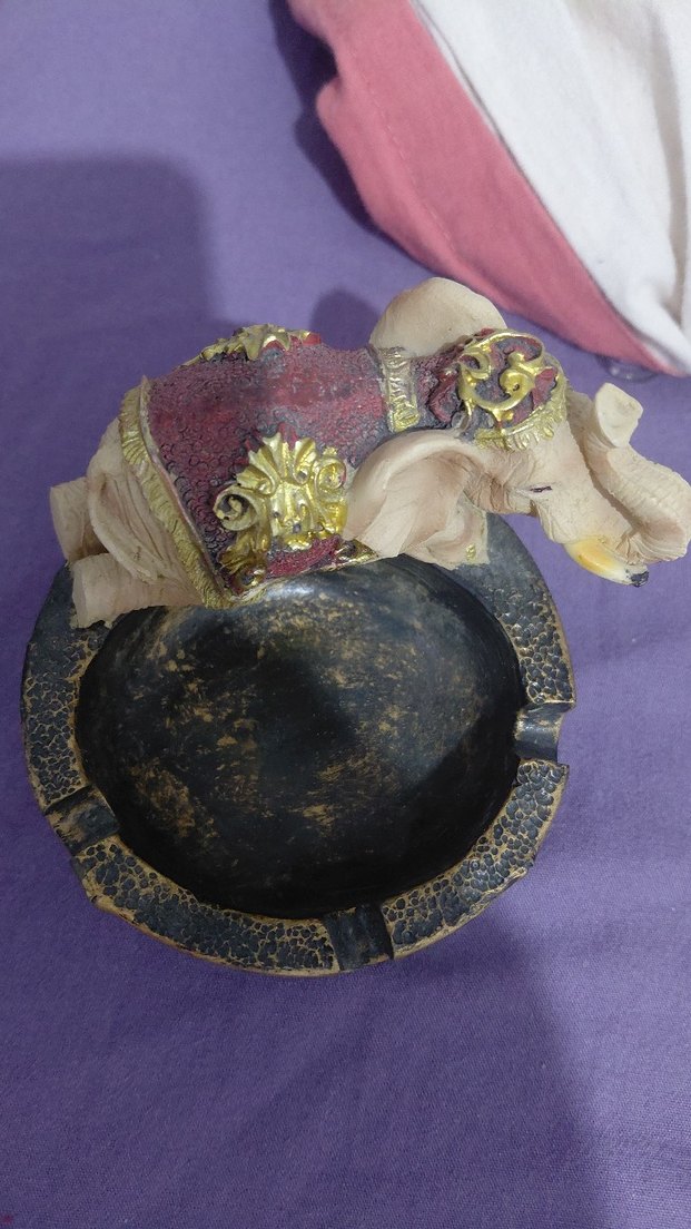Altın detaylı fil figürüne sahip koyu tonlu küllük, hem işlevsel hem dekoratif bir üründür.