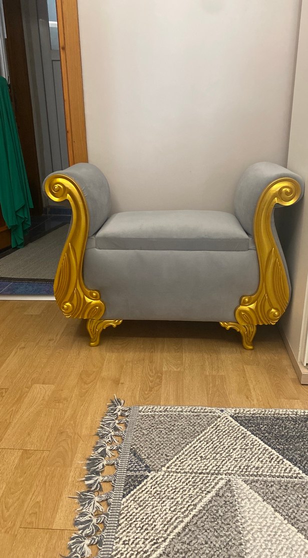 Yumuşak gri kumaş ve altın renkli süslü kolçaklar ile ayaklara sahip çocuk koltuğu, konfor ve şıklığı bir arada sunar.
