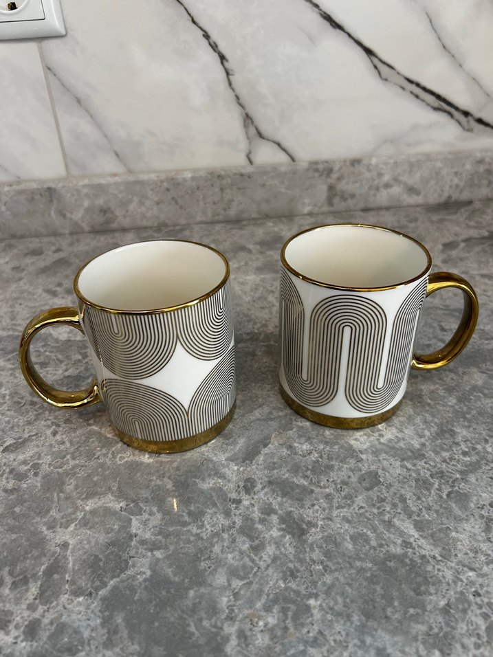 Gri geometrik desenlere ve altın renkli kulplar ile kenarlara sahip iki beyaz seramik kupa seti. ☕