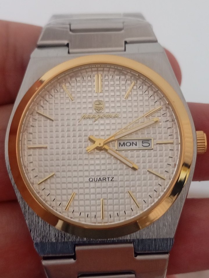 Gri dokulu kadran ve altın detaylara sahip erkek saati, gün ve tarih göstergelidir. Modern klasik tarzda, metal bilezikli ve quartz mekanizmalı. Gün göstergesinde 'MON' yazıyor. ⌚