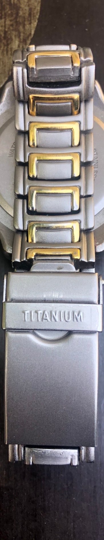Altın detaylı gri titanyum erkek saat kayışı. Vintage tarzda ve "TITANIUM" yazılıdır. ⌚