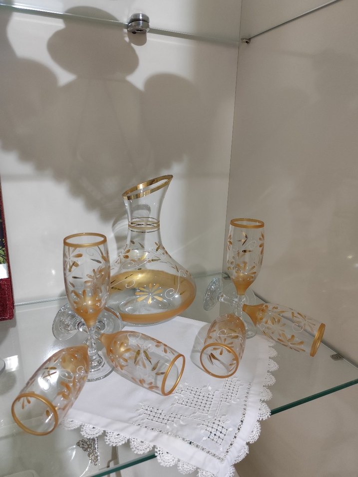 İnce cam sürahi ve altın detaylı altı kadehten oluşan set, zarif çiçek desenleri ve ince altın kenarlıklara sahiptir. vitrinim için aldım ama hiç kullanmadım yepyeni duruyor