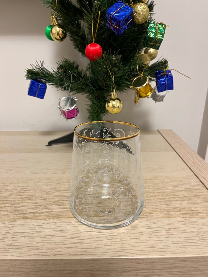 İnce beyaz işlemeler ve açık altın renkli kenarı olan şeffaf cam bardak, zarif bir görünüm sağlar. 6lı
