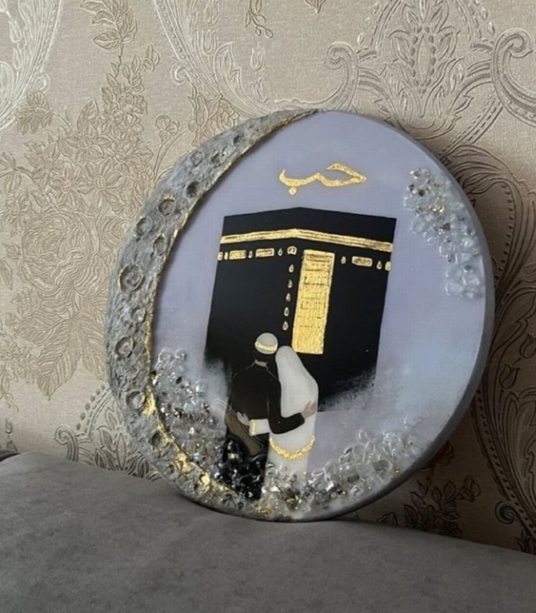 Kabe ve iki figürün altın detaylarla işlendiği, koyu zeminli yuvarlak tablo. Dokulu çerçeve ve altın Arapça yazı içerir. sevdiklerinizle kendiniz için mükemmel bir hediye istenilen modelleri gönderin biz yapalım. (resim pinterest'ten alınmıştır istenildiği takdirde yapılacaktır)