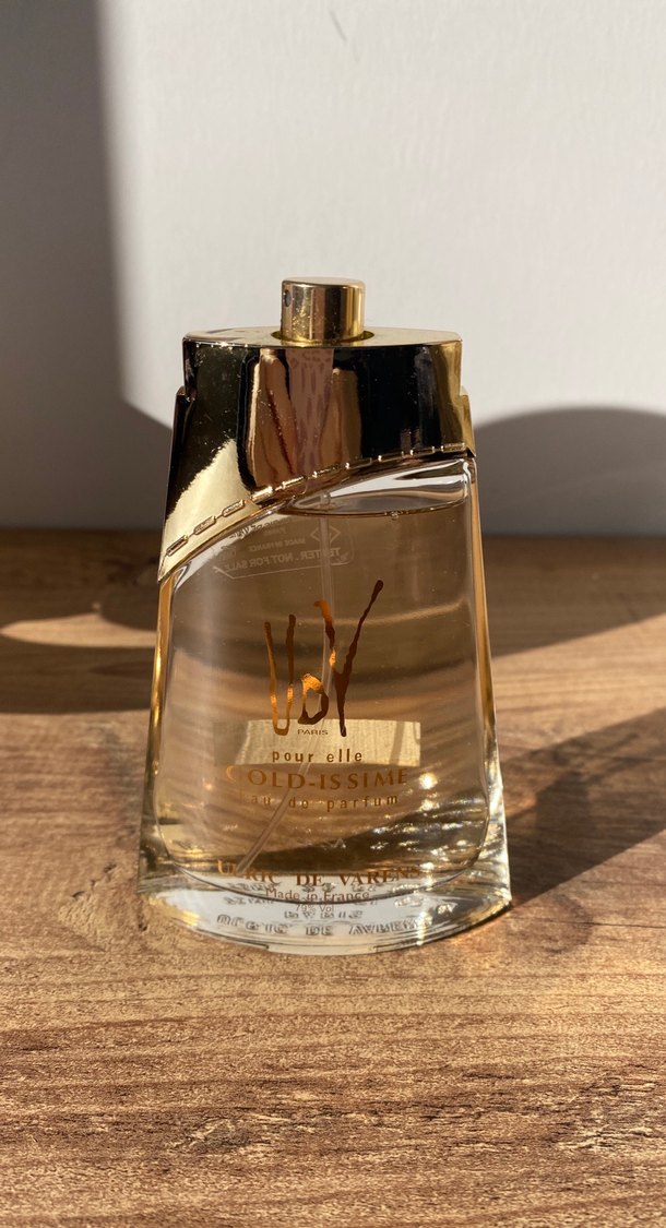 Altın detaylı şık tasarıma sahip şeffaf cam şişede kadın parfümü. Zarif ve sofistike koku sunar.