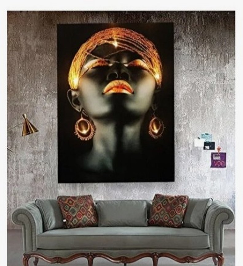Bu tablo, başlık, dudaklar ve küpelerde canlı altın detaylarıyla karanlık tonlarda bir portre sunar, etkileyici bir görsel oluşturur. ledli ledsiz de kullanılabilinir 60x90 cm