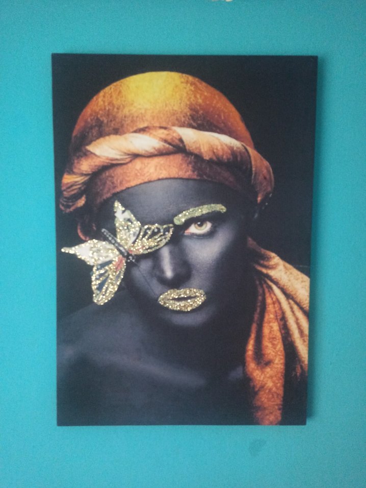 Modern duvar sanatı, altın kelebek ve sim detaylarıyla koyu arka planda bir portre. Her odaya özgünlük katıyor.