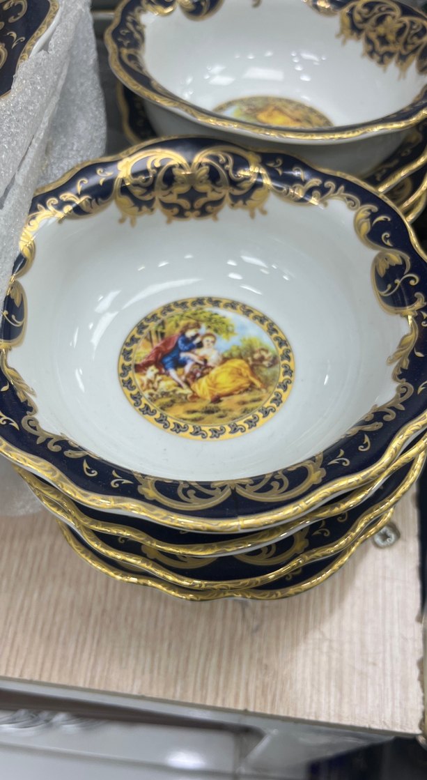 Koyu mavi ve altın baskılı desenlere sahip, ortasında detaylı bir görsel bulunan klasik tarzda bir tabak. ️