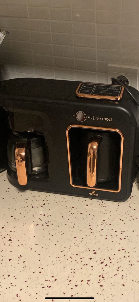 Koyu renk gövde ve altın renkli kulplarıyla şık kahve makinesi. Cam sürahisi ve kolay kontrol düğmeleri bulunur. ☕ herşeyi calısıyor detaylı bilgi veririm