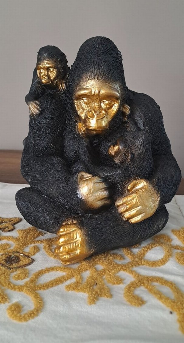 Yüzü, elleri ve ayakları altın detaylı, koyu renkte maymun figürü. Anne maymun iki yavrusunu kucaklıyor.