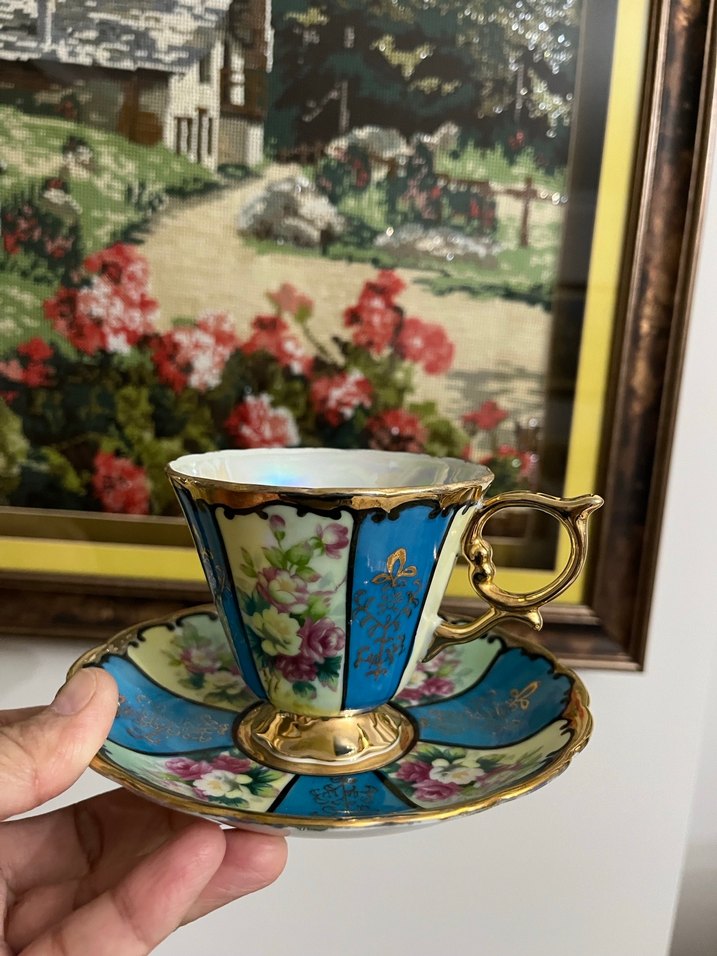 Koyu mavi ve pembe paneller, çiçek desenleri ve altın detaylarla süslenmiş porselen fincan ve tabağı. Altın kulp ve kenar şıklık katar. ☕Kıymetli antika fincan