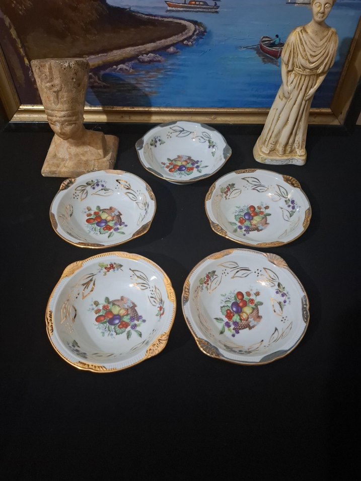 Altın detaylı, renkli meyve desenli beyaz porselen kaseler seti, servis için uygun. Polonya damgalı atık kırık çatlak yok sadece bir kasenin kulp kısmında minimal yaldız kaybı var