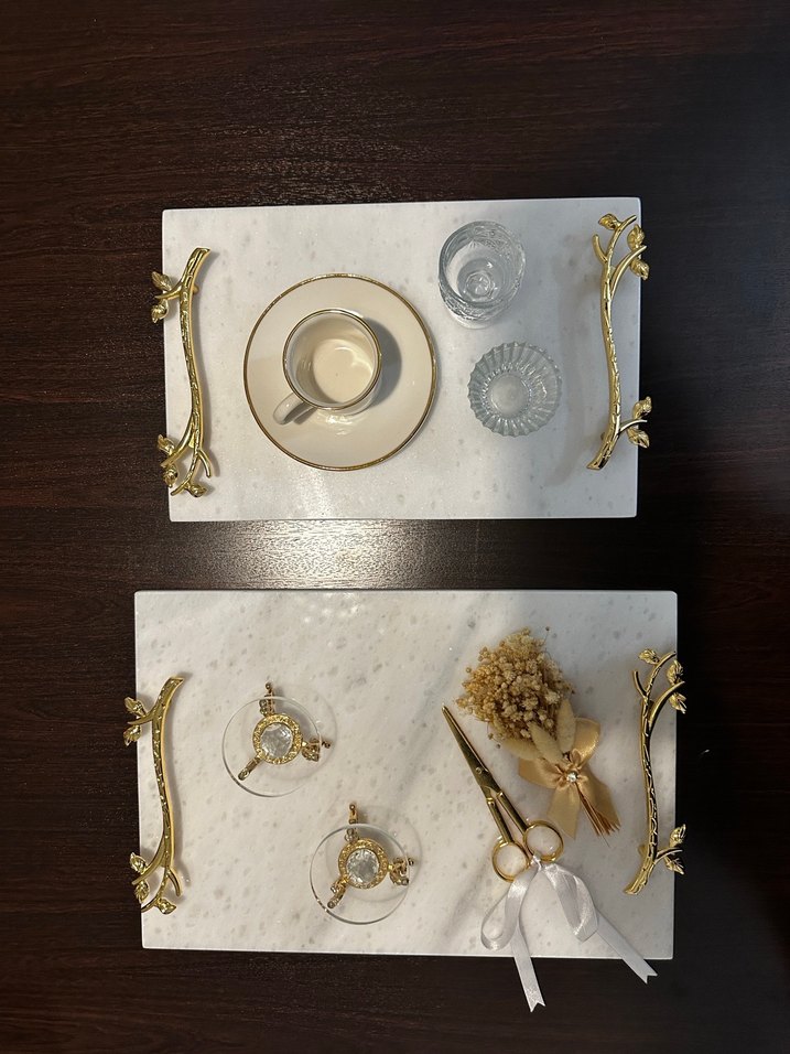 Altın saplı, modern klasik tarza sahip beyaz mermer tepsiler isteme kahvesi ve nişan yüzüğü tepsisidir