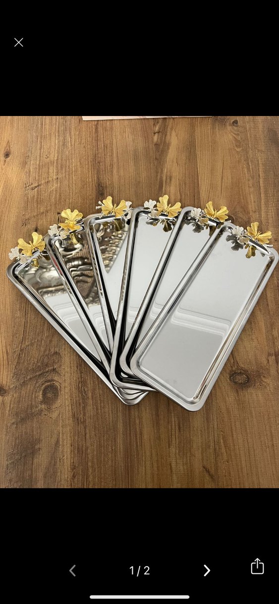 Altın çiçek detaylı, parlak yüzeyli dikdörtgen tepsi seti. Sunum ve dekorasyon için uygundur.
