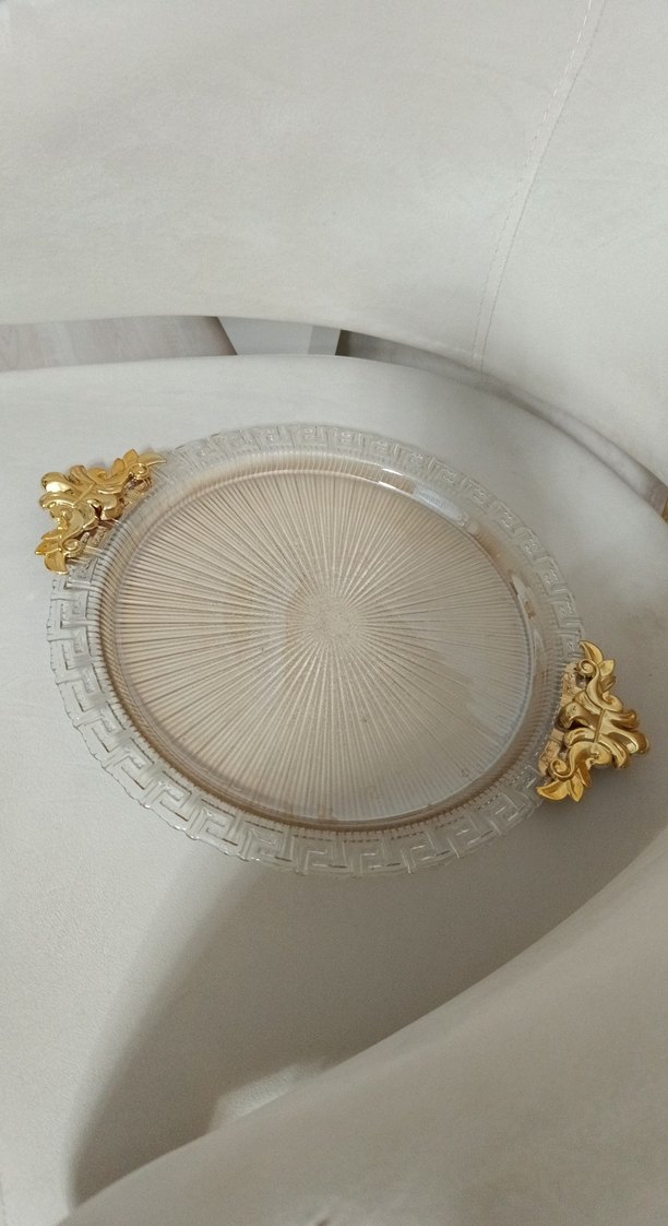 Parlak altın detaylara sahip, desensiz ve hafif dokulu yüzeyli modern klasik tepsi. Şıklık ve işlevselliği bir arada sunar. ✨ Gold sunumluk tepsi veya çay tepsisi bir kere kullanildi