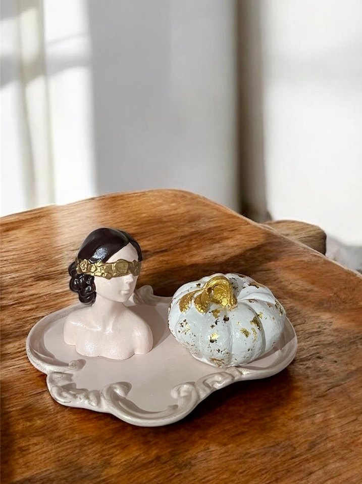 Altın körüklü bir büst ve altın detaylı beyaz kabak içeren pastel renkli figürlü tabak. Dekoratif ve sanatsal tasarım.