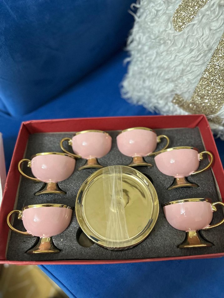 Altın sap ve taban detaylı, pastel pembe renkte altı fincan ve uyumlu altı tabak içeren set. ☕