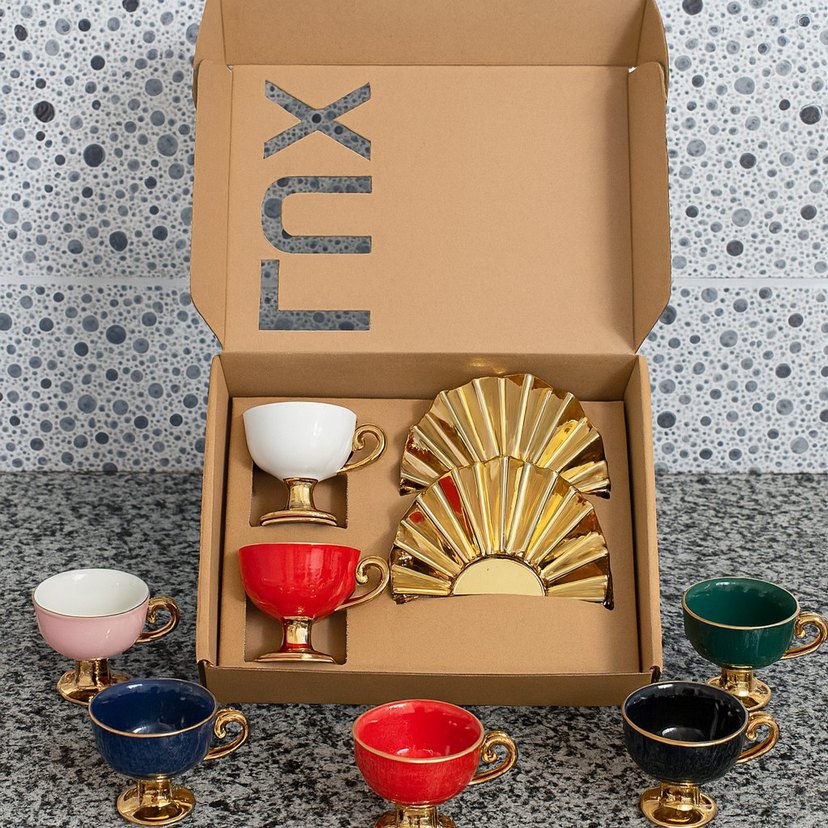Altın kulplu ve tabanlı renkli kahve fincanları seti, altın renkli dekoratif parçalarla kutuda sunulur. ☕