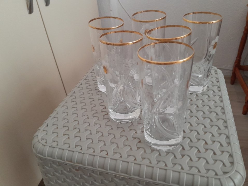 Şeffaf su bardakları, hafif altın renkli kenar detayları ve zarif kabartmalı desenlere sahiptir. Her bardakta dekoratif altın vurgular bulunur.