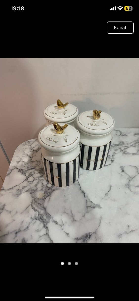 Altın kuş figürlü kapaklara sahip, siyah çizgili beyaz seramik üçlü baharat kavanoz seti. Altın siyah beyaz çizgili, üstü altın renkli kuş figürlü kapaklı seramik baharat kavanozları seti. Mutfakta baharatları düzenlemek için uygun. Sadece 1 kavanoz kapağının lastiğinde sararma vardır onun dışında herhangi bir kusuru bulunmamaktadır. (Boy 15 cm En 10 cm dır.)