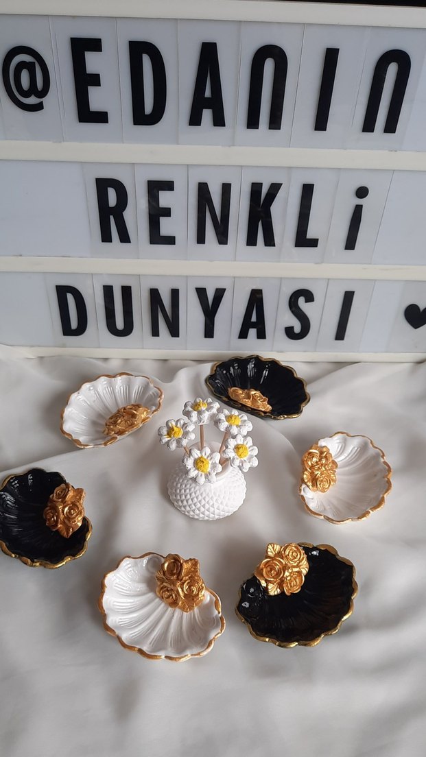 6 adet fiyatıdır Siyah ve beyaz tabaklar altın çiçek detaylarıyla birleşiyor. Ortada beyaz sarı çiçekli modern klasik vazoya sahip set.
