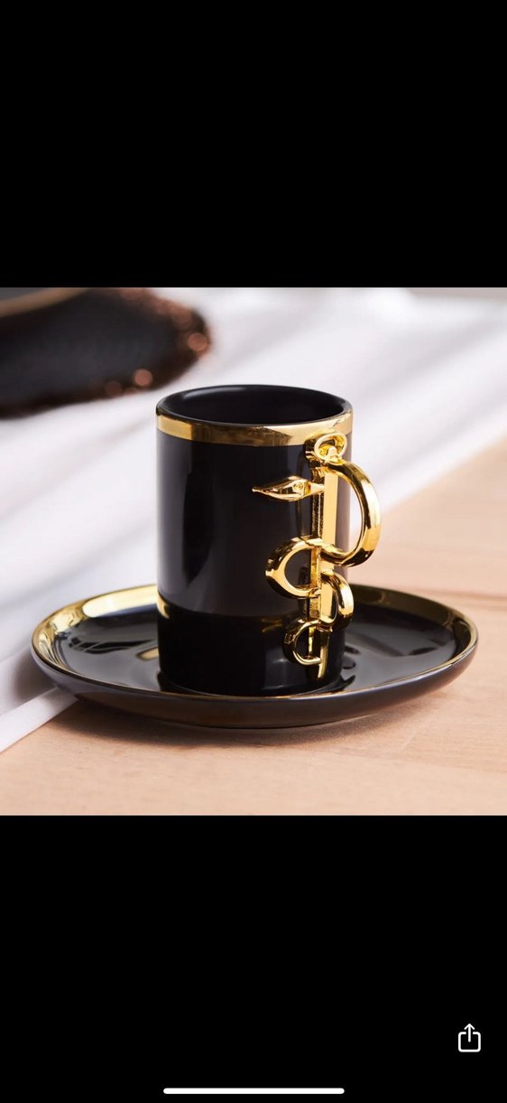 Parlak altın detaylı, özel sap tasarımlı siyah fincan ve tabak seti. Şık kahve veya çay keyifleri için uygun. ☕