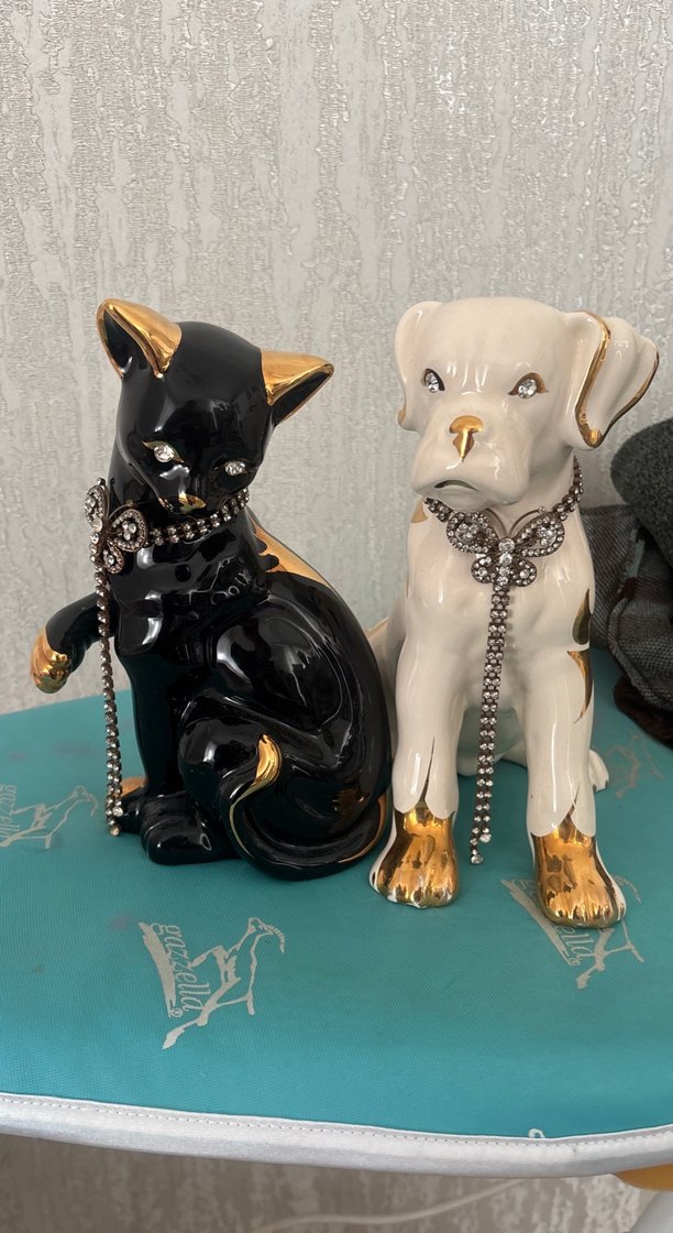 Altın detaylı siyah kedi ve beyaz köpek figürleri, taşlı tasmalarla süslenmiş dekoratif ürünler. Mekana şıklık katar.