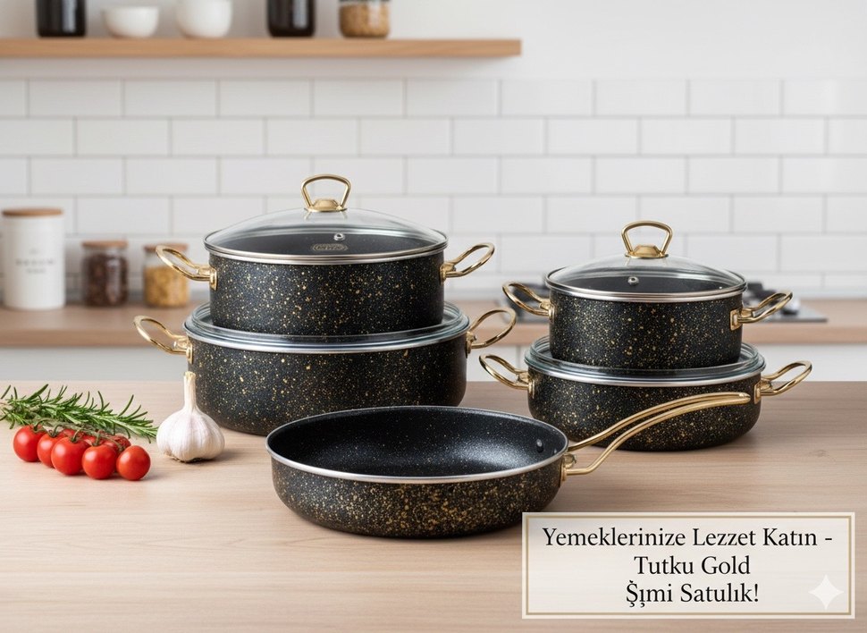 Altın saplı ve kapaklı siyah tencere ile tava seti, yemek pişirmede çok yönlü kullanım sağlar. Yemeklerin $in Tu yazısı görünüyor.