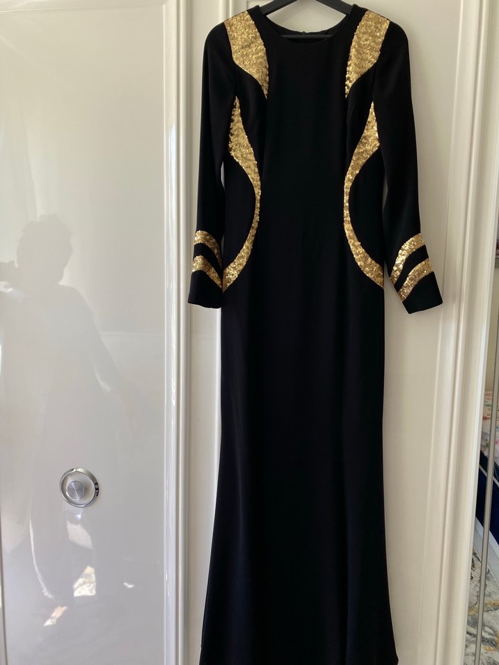 Altın Detaylı Siyah Uzun Abiye Elbise