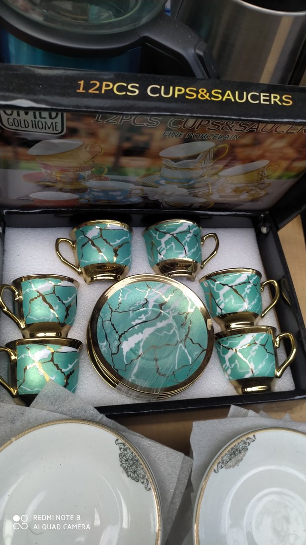 Altın detaylı, mermer desenli turkuaz renkli 12 parça fincan ve tabağı seti. Fincanların kulpları ve kenarları altın rengindedir. ☕